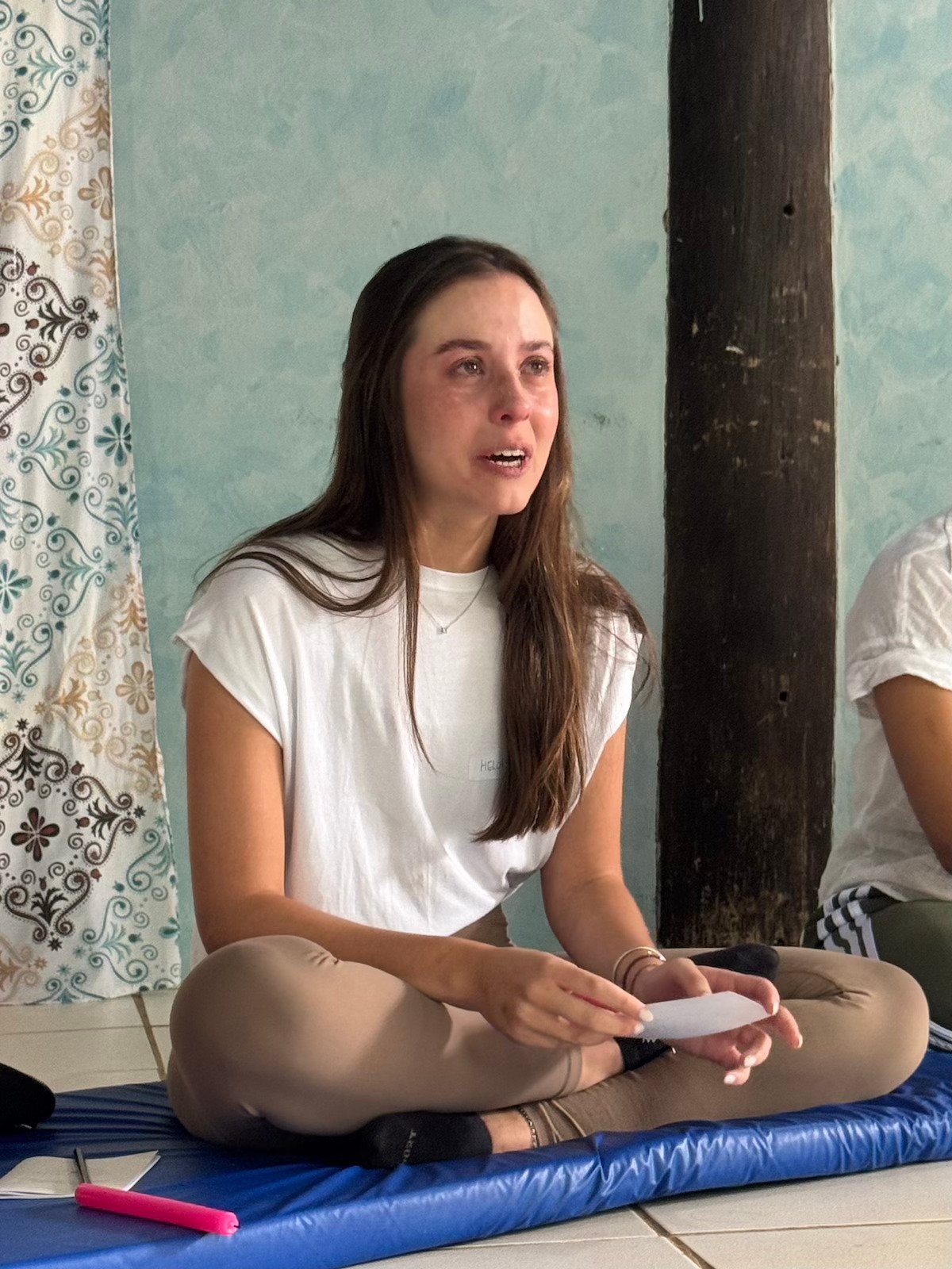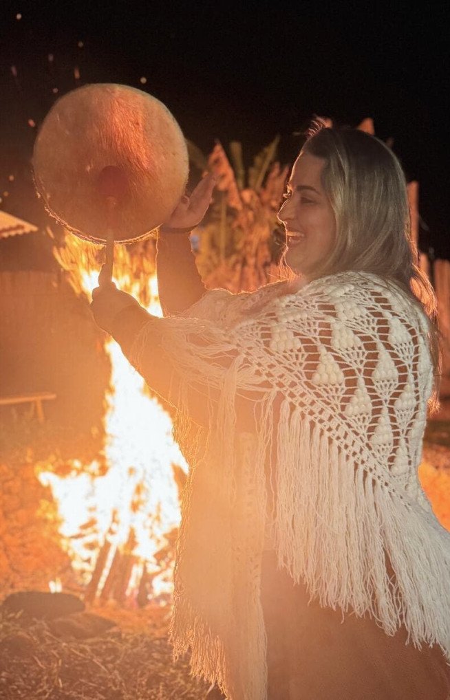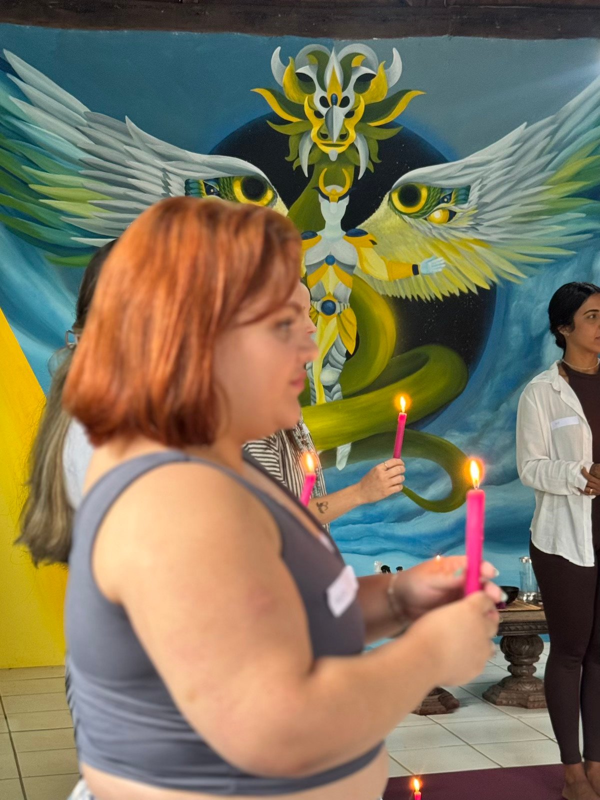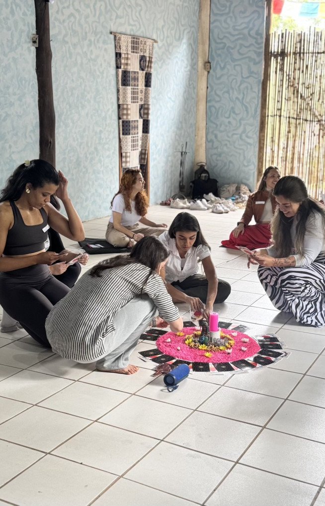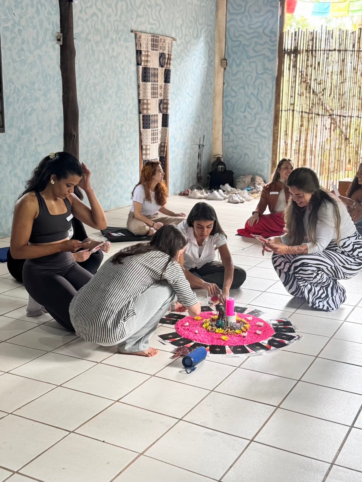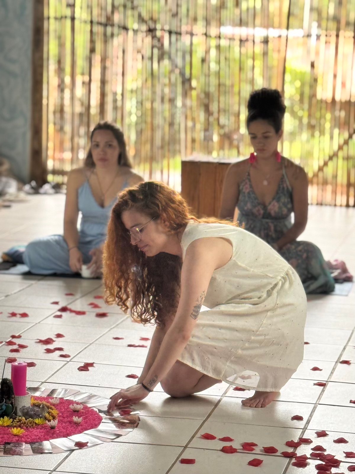 Pode incluir momentos de integração do grupo, respiração consciente (breathwork), práticas corporais, natureza, rodas de partilha, exercícios de autoconhecimento e rituais simbólicos (como cacau, quando fizer sentido). A proposta é unir sentir, presença e reconexão.