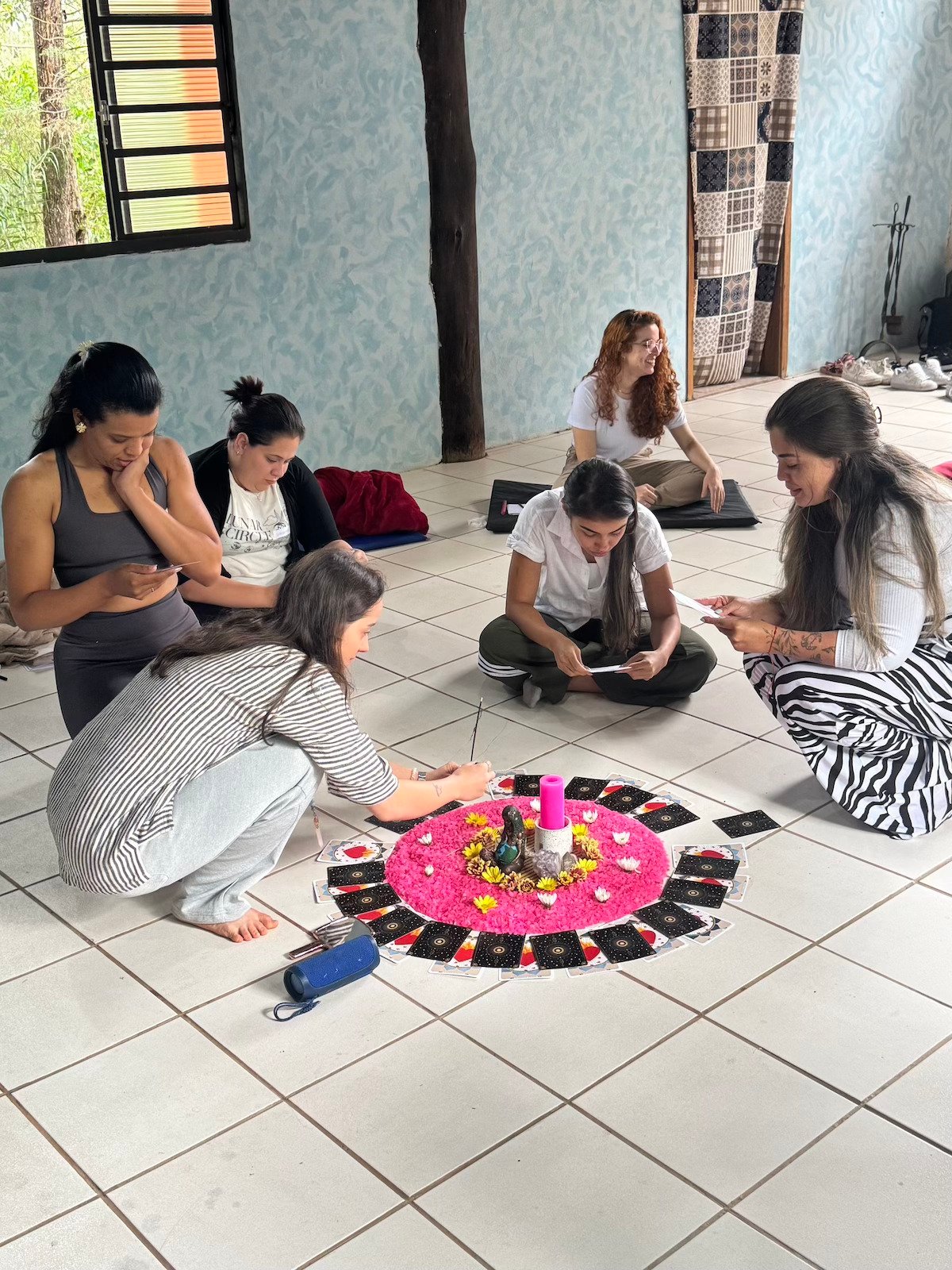 Momentos de troca e acolhimento em círculo, onde o apoio e a conexão com outras mulheres potencializam a força e a união feminina.